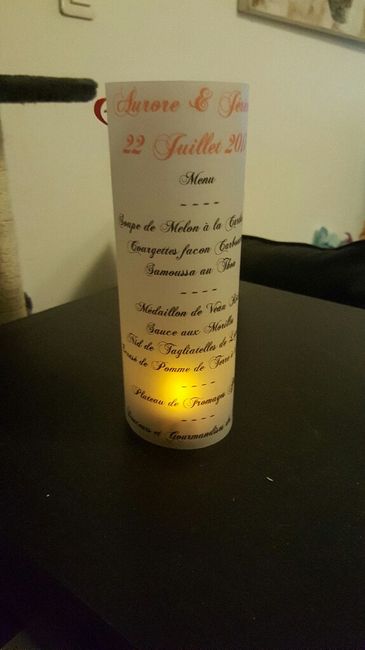 Voilà j'ai imprimer mon menu sur du papier calque et fait un joli laçage avec un ruban rouge .La bougie à l'intérieur est une bougie led.