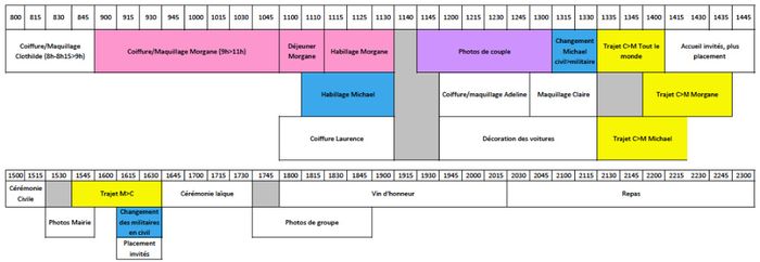 Bonjour tout le monde! Nous avons besoin de votre aide, nous aimerions planifier entièrement la journée de mariage (horaire mairie, église, photo, VH, entrée, plat, dessert, animation, etc etc...), c'est pourquoi j'aurais voulu savoir si certains...