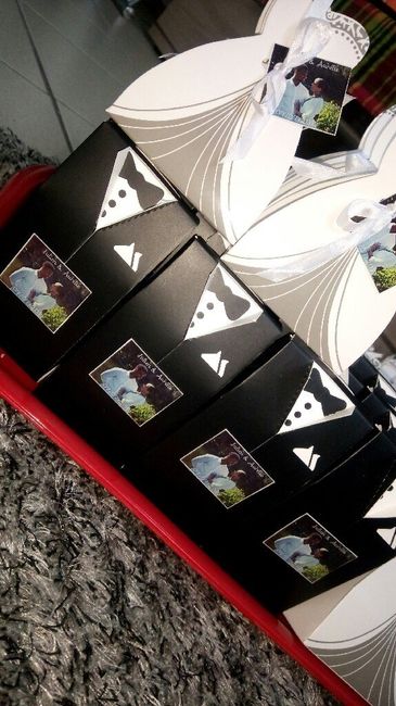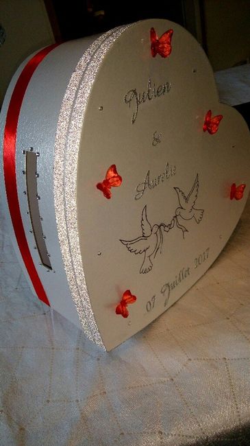 Voici nos boîte à dragées et Nos serviettes en papier sur le thème papillon... Couleur: Blanc, argenté et rouge