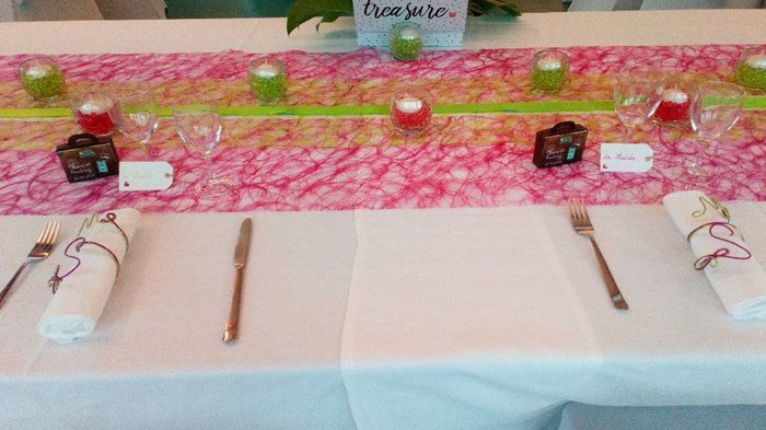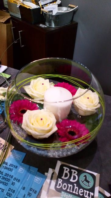 Bonjour les filles. Ils nous restent 40petits jours et on essaient nos decos de table. Je vais vous demander de la tolérance, les fleurs sont fanées, les liquides des bougeoirs vont être des billes d eau vert anis et rose fuschia et le chemin de...