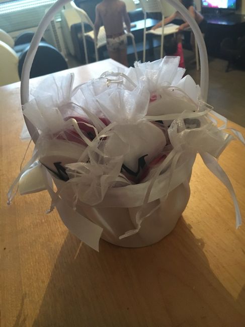 Voilà les filles du 8 juillet on approche déjà A fait mes dernier achats de dernière minute qu'en pensez vous du panier avec des petite pochette de confettis rouge et blanc les filles ce soir je mes les filles de dragées dans les verre graves