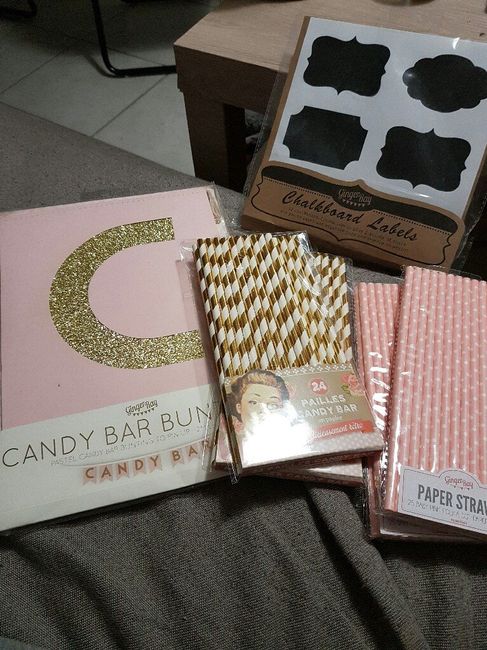 Coucou les filles, voilà enfin reçue une grosse partie de la deco de mon Candy Bar manquera quelques macarons pour la deco, j'ai les bonbonnières et la fontaine à boisson qu'est ce que vous en pensez ? J'ai aussi reçu notre tampon personnalisé je...
