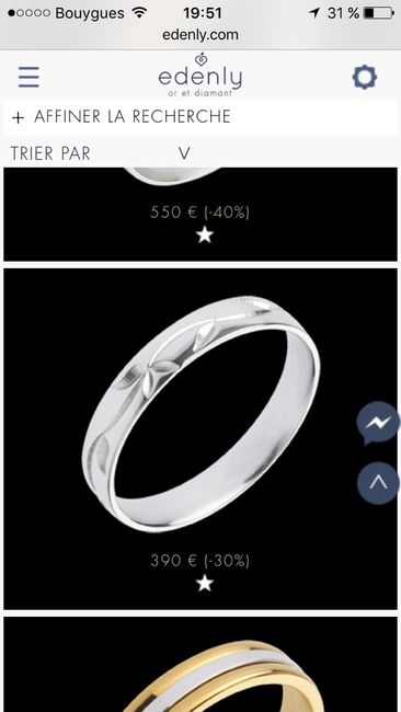 Ayé nous avons trouvé la bijouterie qui avait pile poil nos modèles d'alliance coup de coeur en boutique.. 70% sur la moins chère (la mienne lol) et prix revu selon taille du doigt de chéri avec 50EUR de moins.. 2 ans d'entretien offert, gravures...