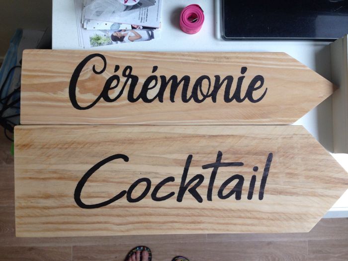 Bonjour ! C'est dimanche et je suis seule à la maison alors c'est DIY pour le mariage. J'ai commencé les 2 premières flèches de notre panneau directionnel. L'écriture est au feutre noir, les contours ont un peu bavé mais rien de méchant faut vraiment...
