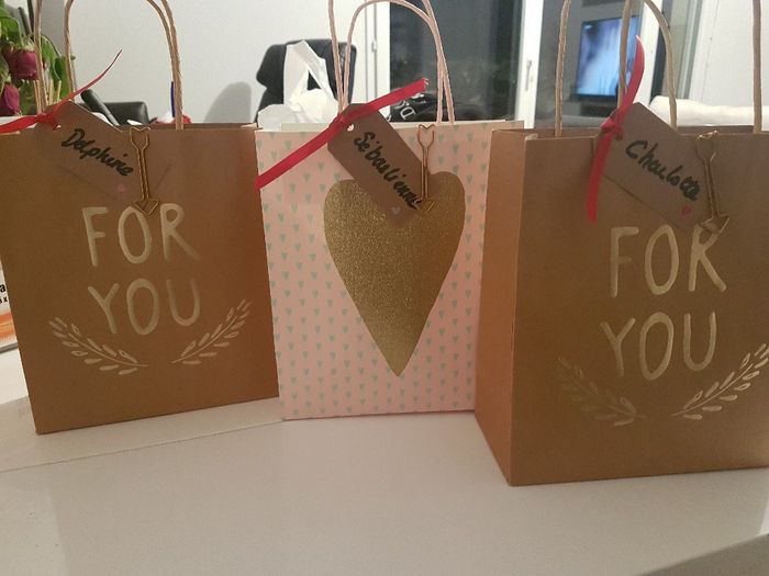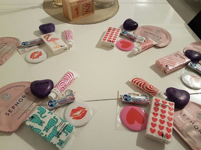 Contente aujourd'hui j ai fais mes premiers achats cadeau pour mes 2 temoins et mes 3 demoiselles d honneur . Il me manque encore des trucs a trouver J ai mis : un miroir de poche , des chewing-gum ,creme pour les mains , un masque éclatant pour le...