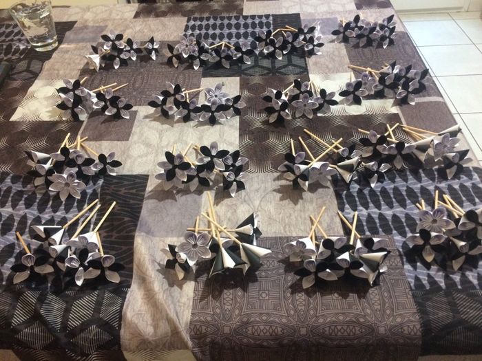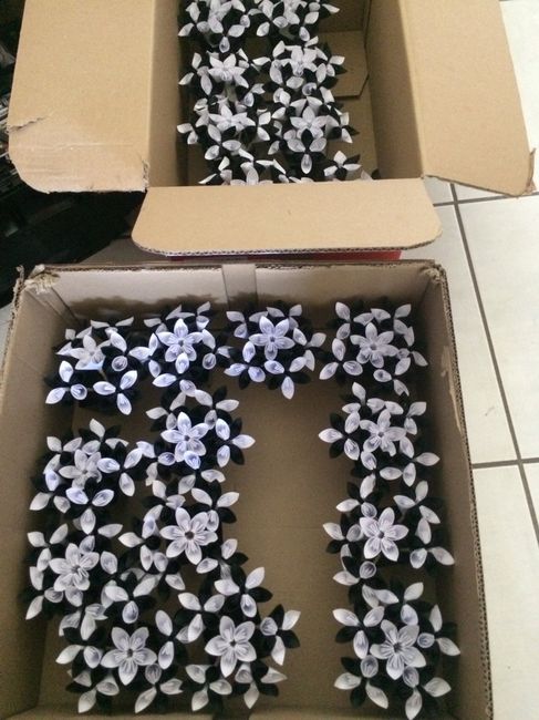 Apres dès heures et des heures de pliage et de collage 120 fleurs 🌺 ... je compte plus les heures j'ai fini à j-8 ... bon il reste encore quelques noeud de voiture à faire et les dragées a metttre encore dans leur sachet....