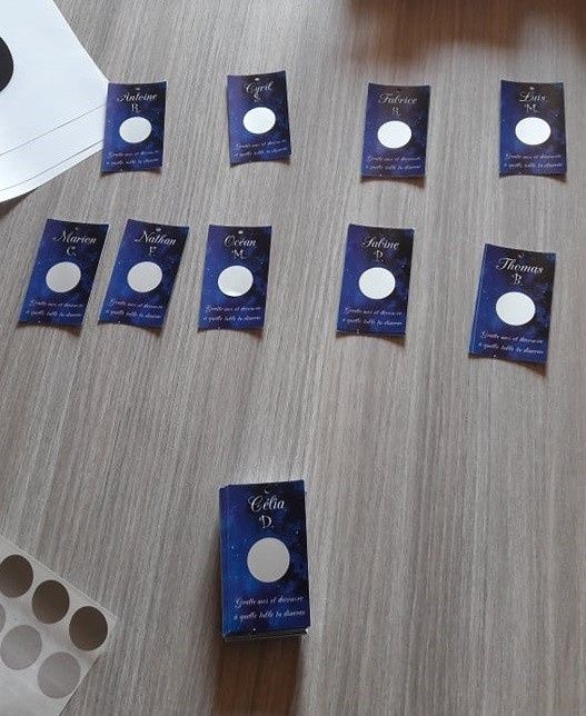Coucou les brides, Ca y est!! Le plan de table est terminé! On est parti sur des cartes avec le prénom de chacun et des pastilles à gratter. Qu'en pensez-vous? A la place de la feuille blanche sur la 1ère photo on mettra une petite affiche (3ème...