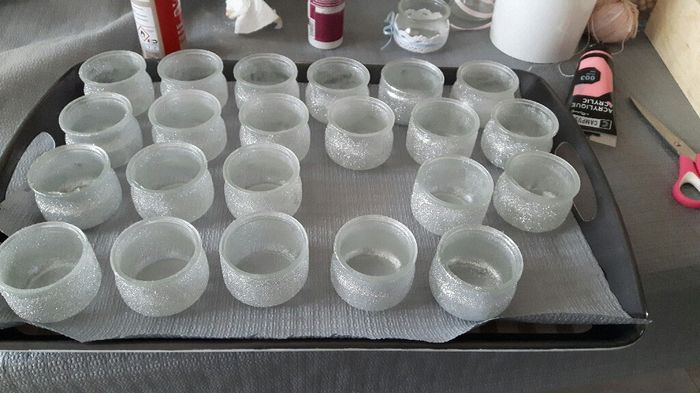 Apres avoir manger et obligé toute la famille a manger des crèmes brulée la laitière. Une partie des photophores sont customisés^^ Vous pensez que la lumiere de la bougie va passer au travers des paillettes et donner un effet sympa?