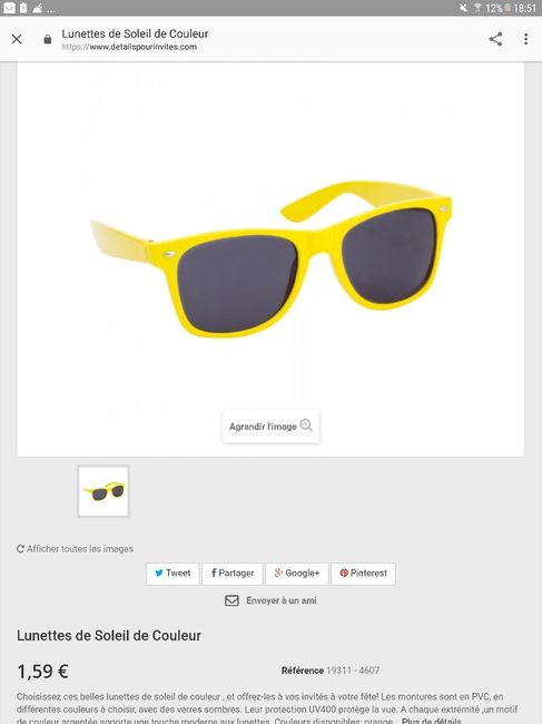 Bonjour tout le monde !!!! Je souhaiterai acheter pour les invités des lunettes de soleil colorées (style Rayban ) pas trop chères, t'en qu'a faire 😁😁 Le moins cher que j'ai trouvé pour l'instant c'est sur le site : Détails pour invités à 1€59 . Mais...