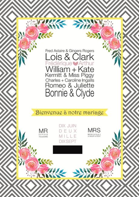 Bonjour les brides-to-be Je voulais vous demander conseil sur mon panneau d'accueil car je vais l'envoyer bientôt chez l'imprimmeur. Je voulais sonder un peu vos avis. Je pense l'imprimer en format A2, le mettre dans un cadre et le poser sur un...