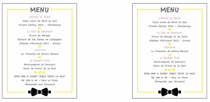 Bonjour les filles, plus que 42 jours au compteur , j'en reviens toujours pas !!! Ca passe trop vite. Aujourd'hui, je vous embête un peu en lancant un sondage pour m'aider à départager mon menu. Avec chéri, nous avons souhaité des intitulés un peu...