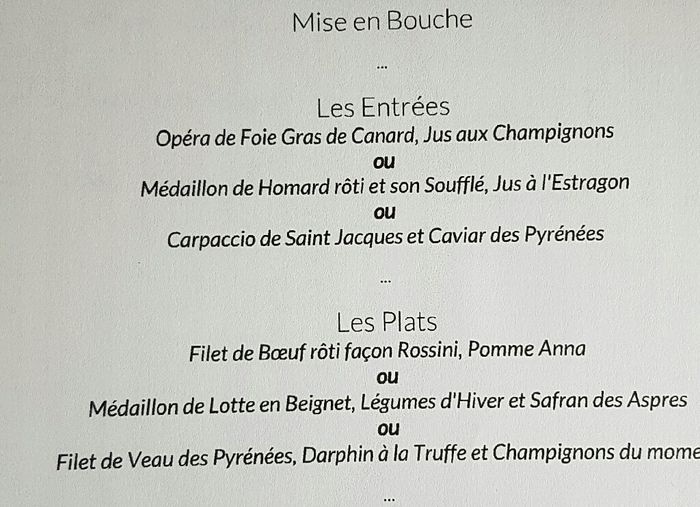 Voilà mon menu j'hésite énormément sur le plat .....L'entrée ce sera le homard Pour le wedding cake on me demande de choisir le parfum ohlala je sais pas ! Merci pour vos avis Bisous