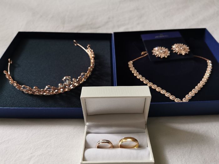 voilà je partage avec vous les filles Alliances or jaune pour lui, or rose et pierres blanches pour moi, Pas envie de s'obliger à avoir la même chose par contre nous avons la même gravure à l'intérieur Or rose pour les bijoux pour ma tenueLe diadème...