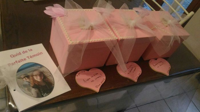 Coucou tout le monde.Et oui voila j'ai faut la demande à ma première témoin. Je lui ai emballé le petit coeur que j'ai peint. Sur celui ci était écrit "acceptes tu d'être ma témoin ". Elle a répondu avec les larmes aux yeux oui !!! Je vous mets en...