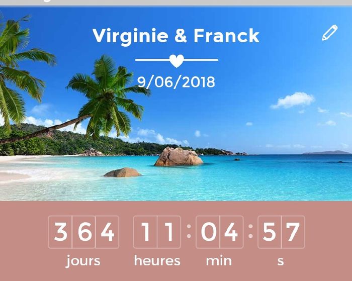 Bonjour tout le monde, on est enfin à 1an du mariage !!!Je vois beaucoup de personnes qui mettaient leur date et il me tardait de mettre la mienne aussi mais j'ai l'impression que c'est loin encore !! Quand je me suis inscrite j'étais à 566 jours ...