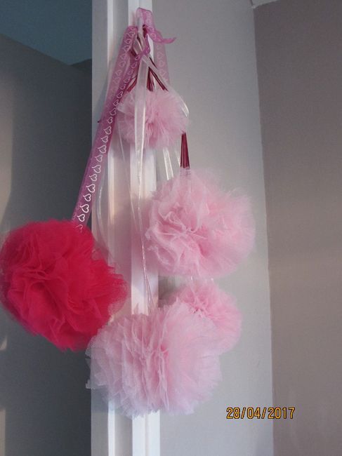 et voila mes pompons en tulle réalisés avec mes fils !! il y en a encore une vingtaine(rose clair dominants et qq un fushia et 2-3 ivoire!!) i'm so happy :-) pompomns en pagaille
