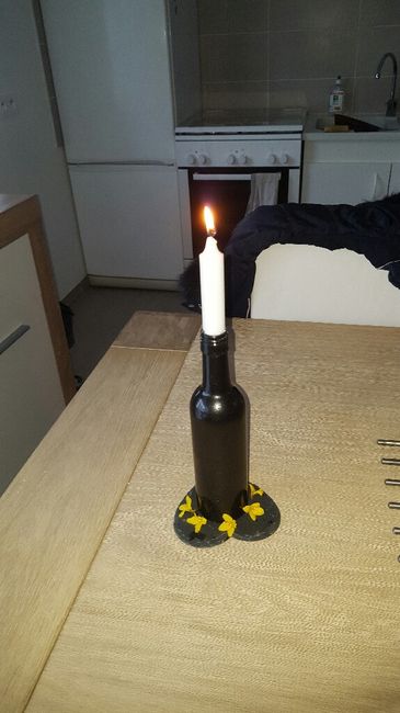 Bonjour la commu ! Que pensez-vous de mon centre de table. Les photos sont des ébauches... Pour les tables rondes (1ère photo) Le socle est une assiette ardoise carré, les deux photophores sont les menus (en moins froissés), les bouteilles ne sont...