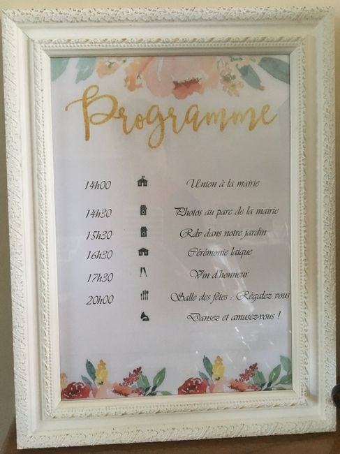 Bonjour à toutes! j’aimerais faire un petit « programme détaillé » de la journée est ce que certaines en ont fait ? je ne sais pas si je fais simple : 14h mairie, 15h photos ... ou avec des petites phrases sympa🤔18h trinquons, 20h réaglez vous ......