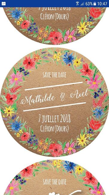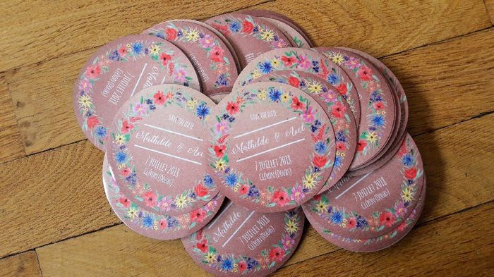 Salut les filles !Faites-vous un save the date ?Ici oui, ils vont bientôt partir àl'impression.Ce sera des magnets ronds avec une jolie couronne de fleurs, nos prénoms, la date et le lieu.