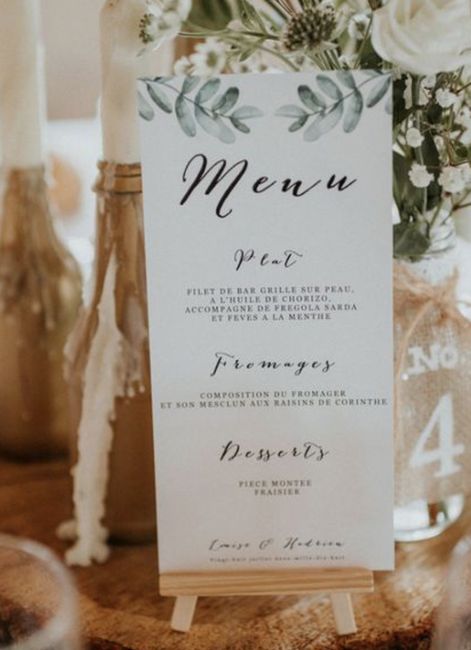 Coucou, Je suis entrain de commencer à faire les cartes de nos menus. Mais j'hésite sur la forme. Par exemple le traiteur a donné des noms aux plats (noces d'amour, le nuage...) c'est joli mais bon c'est vague. Je pense partir basique avec la...