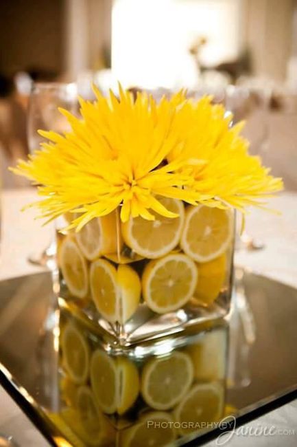 Hello les filles,Hier j'ai fait un test avec les vases qui seront au centre de la table (avec d'autres). Pour rester dans mon thème jaune et car j'adore le citron, on a coupé des rondelles et on les a mises au bord du vase. Cest une feuille rigide...