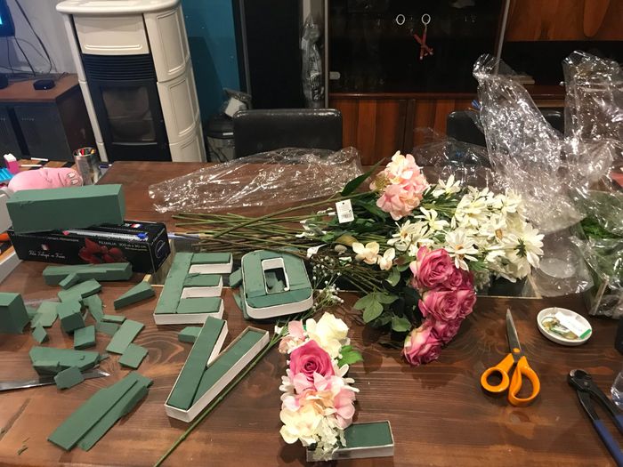 A 13 jours du mariage tout sâaccĂ©lĂšre. Petit Diy de ce soir. Des lettres en carton patte piquĂ©e de fleur artificielle.
