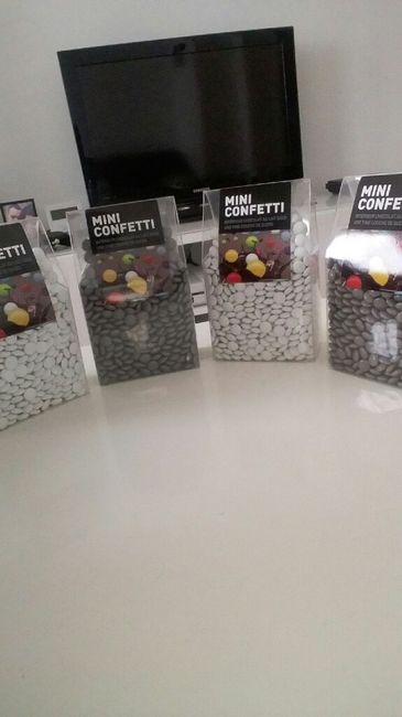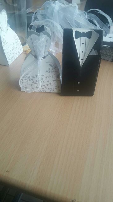 Voilà on a acheter les dragées au chocolat pour les mètre dans des boîtes en forme de caustard est robe de mariée ☺