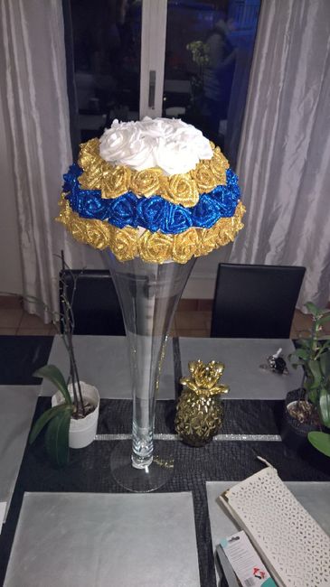Salut a tous voila notre centre de table pas tout à fait fini il manque les perle d'eau dans le vase et quelque pampille qui pandouille mes comment trouver vous notre demi sphère ? Sachant qu'on va inverser les couleur à chaque fois 😊