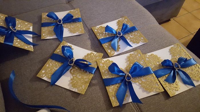 Bonjour a tte ! Voici nos faire part qu'on a commander sur aliexpress et quon a customiser de nos petite mains😊 notre theme couleur comme vous pouvez le voir bleu et doree 😍😍 Voila j'espere que sa vous donnera des idees ..😊