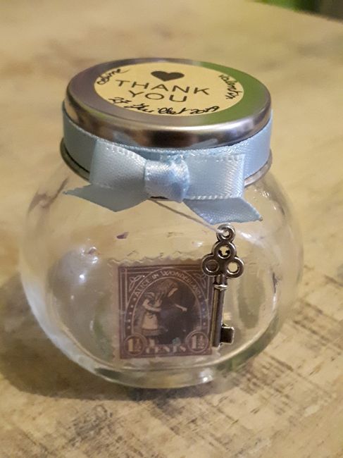 Je dis mignonnettes mais c'est peut être pas le mot exact ^^... Mes contenants en verre viennent d'action. J'ai réalisé moi même l'étiquette qui est dessus et qui sera raccord avec mon faire part (car il y aura aussi les fougères que l'on y voit) ....