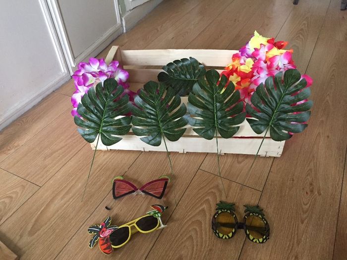 Hourra! Mes premiers éléments pour le photobooth en mode hawaii sont arrivés! J'ai hate de recevoir le fond et les juppes hawaiennes 😍 Et les chapeaux et les moustaches et les perruques...🙃 Photobooth hawaii
