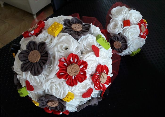 Bonjour bonjour ! Après l'avoir défait et refait une bonne centaine de fois, voici mon bouquet, ainsi qu'une mini-version qui sera pour ma fille. D'ici le mariage il y a des chances pour que je change encore quelques trucs ... Les roses sont en...