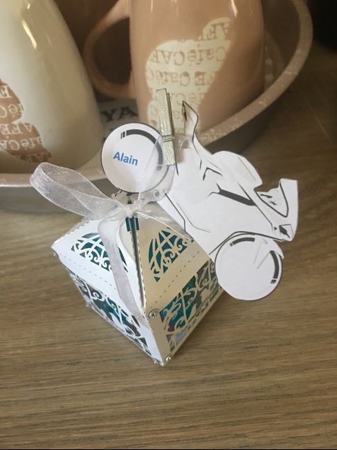 Pour ne pas me perdre et gagner du temps et surtout pour vérifié si tous le monde à bien son porte nom son cadeau etc j'ai pris une boîte à chaussure par table, dedans j'ai mis:Le nom de la table et son supportLes portes nomLes Pochon de dragibusLes...