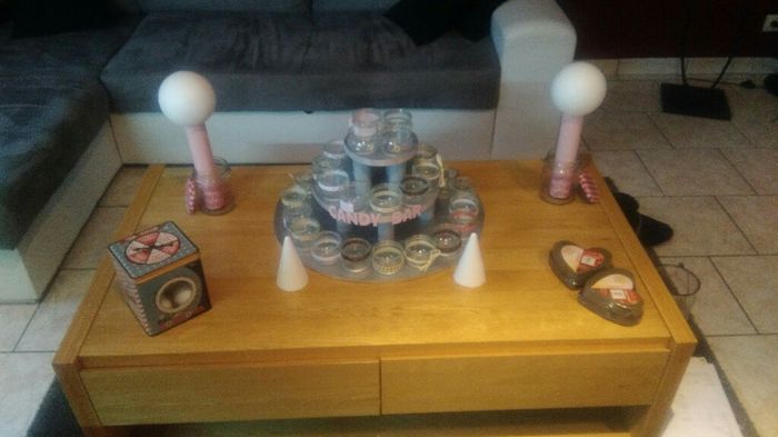 Bonsoir à toutes et à tous voila un aperçu de notre candy bar non rempli il manque les bonbons et les sucettes et le mur de fleurs... A vos avis ...