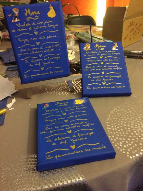 Coucou tout le monde petite journée dédiée au mariage aujourd’hui , avec notamment la fabrication de nos menus . Un menu sera placé par table avec dessus deux personnages en lien avec le thème de la table. qu’en dites vous ?