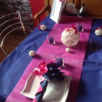 Voilà notre petite essai. Le centre de table avec les vases est au bout parce que le jour J il y aura deux tables en enfilade ! !! J'ai comme l'impression qu'il manque quelque chose ??!!