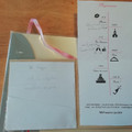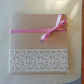 Bjr! voilà un brouillon de mes faire-part sur le ruban rose devant Il y aura un petit papier avec nos nom accrocher que j'ai perdu lol à l'intérieur côté gauche le rabat où il y aura les cartes...