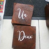 Hello Maintenant que mon papa m'ait découpé mes tronçons de bois et qu'ils sont enfin vernis jai commencé mes écritures😊 c'est long mais le résultat j'adore😍😎 bon plus que 13 a faire 😅