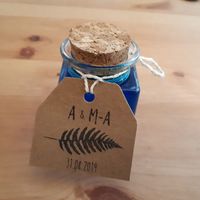 Salut la communauté, Après vous avoir montré mon tampon avec logo hier. Aujourd'hui c'est mon essai pour le cadeau des invités que je vous présente. Une mignonnette avec bouchon de liège qui sera...