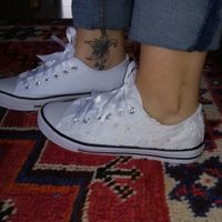 Et voilà, après de nombreux questionnements, du genre talons, pas talons, plat, compensés.... Le choix est fait, se sera baskets plates customisées ! J ai repris de la dentelle dessus pour rappeler le...