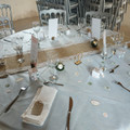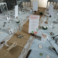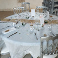 Coucou, Nous avons profité d'une visite de notre salle pour faire un essai de notre déco de table. Voila le résultat : J'ai mis une nappe en papier mais ce sera une nappe en tissu, il manque également...