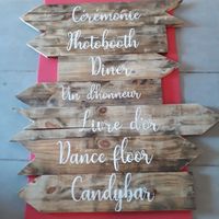 Salut à toutes et à tous, Je suis sûre que ce jour férié a permis à plusieurs d'entre vous d'avancer sur la décoration du mariage. Pour ma part voici nos "créations": - panneaux directionnels enfin...