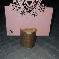 Coucou, j'ai enfin reçu mes papiers marqués place que l'on placera comme ceci d'un un morceau de bois. Qu'en pensez vous ? L'association du rose clair et du bois? Pour le thème champetre
