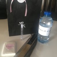 Hello, hier j’ai trouvé les petits sacs en kraft noir que je voulais. Du coup j’ai fait un sac test. Le ruban est rose pour les femmes, avec petite bouteille d’eau (l'étiquette n’est pas la...