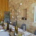 Si cela peut vous inspirer. Une déco composée essentiellement de bouteilles de vin, contenant guirlandes lumineuses et d'autres des arbres à origamis. Les photophores sont des pots récupérés avec du...