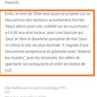 Bonjour les Fm, Je suis tombée sur cet article ce matin. Que comprenez vous ? Que la vie normal (ou à peu près) sera pour la quinzaine de mai ou alors que les ouvertures vont commencer seulement à la...