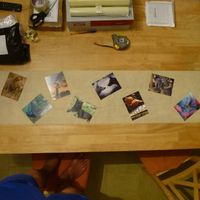 Hello les puces, J'ai coupé les rubans ivoire et parme pour faire le jeu des rubans, j'en ai coupé 5 de chaque couleur d'une longueur de 3 mètres Jeu des rubans Jeu des rubans