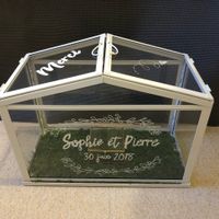 Coucou tout le monde! Voici notre urne terminee! Pour ne pas mettre de la mousse partout j’ai laissé notre boîte à alliances dedans provisoirement 😊 Les mariés du 30 juin... nous sommes sous les 80...