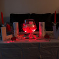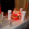 Hello, voilà mes essais déco, avec le vase cognac. On n'a pas de thème, juste des couleurs, qui sont rouge/argenté Les pétales sur la table seront rouges, les menus imprimés sur du calc et décorés...