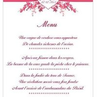Bonsoir bonsoir ! J-26 et j'ai bouclé le menu. Je les ai fait imprimer chez le même fournisseur que mes faire-parts pour garder la cohérence des éléments de papeterie. Là où ma douce et tendre m'a...